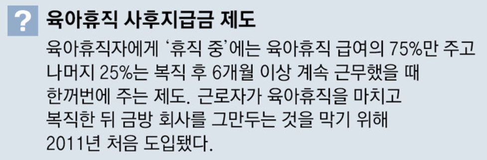 육아휴직 기간에는 육아휴직 급여의 일부만 받고, 나머지는 회사에 복직한 뒤 6개월을 일해야 받을 수 있도록 한 육아휴직 사후지급금 제도가 폐지된다. 휴직기간에 육아휴직 급여를 100% 다 받